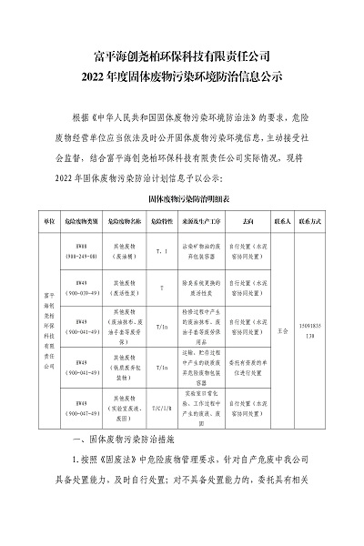 富平海創(chuàng)堯柏環(huán)保科技有限責(zé)任公司 2022年度固體廢物污染環(huán)境防治信息公示