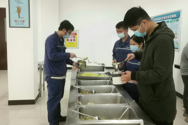 公司高度重視駐廠員工的生活保障,切實關(guān)心關(guān)愛員工,嚴(yán)把食品入口關(guān)。后勤保障組對食材采購、儲存、加工制作、食品留樣等環(huán)節(jié)實行全過程監(jiān)管,優(yōu)化配送服務(wù),停止當(dāng)?shù)厍拦┴洠U蠁T工餐飲安全。公司為臨時入住的員工安排宿舍,采購了被褥等生活物資,滿足員工的基本生活需求。