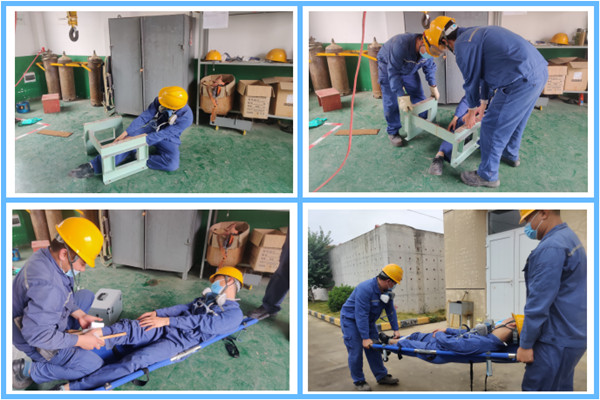 演練開始,隨著安全指揮員哨聲響起,機修班進行的電動葫蘆吊裝作業,突發重物失落,作業人員被滑落的模具砸倒,無法行走。現場人員立即展開營救,對傷員身上重物進行搬離,并立即報告部門負責人,將傷員轉移送往醫院。