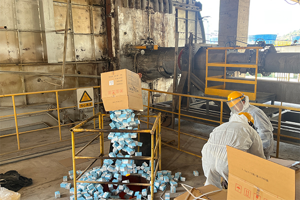 對于大塊廢包裝紙、蜜蠟類藥品先進行破碎入坑,混合后通過漿渣系統送至水泥窯階梯爐內;對于顆粒、膠囊類藥品,則安排專人運送至窯頭,逐一拆封后投入上千度高溫的回轉窯內。處置現場,文山海創工作人員全副武裝,將一箱箱廢藥品倒進水泥窯,短短半個小時的時間,這些不合格產品被順利無害化處理。
