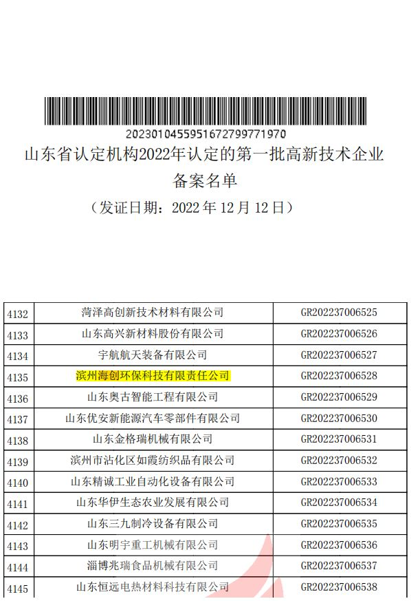 濱州海創(chuàng)順利通過山東省2022年高新技術(shù)企業(yè)認定