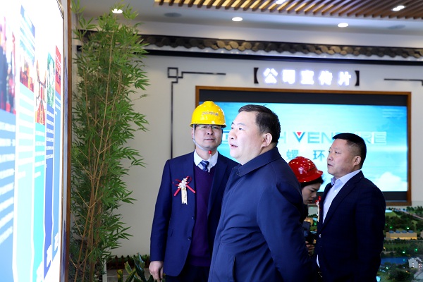 在主廠房一樓展廳,劉飛向李電一行詳細介紹了公司的生產經營、項目建設、生產布局以及產處置規模等基本情況,重點介紹了利用水泥窯協同處置固廢危廢的工藝流程和技術優勢。李電駐足在公司發展歷程展板面前詳細了解海螺環保發展歷程。