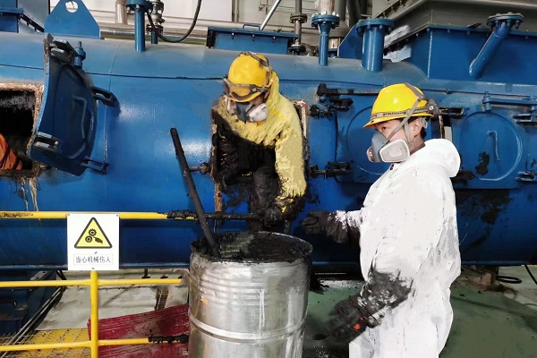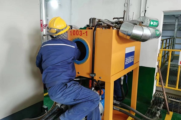 混合器旁有人正在奮力清理物料,即使物料染黑了他們的工作服,也絲毫沒有影響他們的工作速度。液壓站旁,有人正在清理油箱,半蹲不坐的姿勢不知道堅持了多久也絲毫沒有怨言,他們不怕臟、不怕累,不怕麻煩、不辭辛苦,只為減少設備故障,提高設備臺時,完成處置任務。