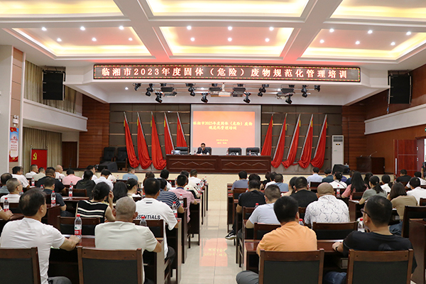 6月30日上午8:00,參會人員陸續到達培訓現場,工作人員熱情引導進行簽到、就坐,并發放公司宣傳資料、播放水泥窯綜合利用固危廢工藝技術宣傳視頻。8:30,活動正式開始,會議由岳陽市生態環境局臨湘分局副局長朱明主持,他指出,7月1日起新的危廢標簽和貯存管理規范將全面組織實施,本次活動采取環保法規培訓和現場檢查演示相結合的方式,針對性明確,目的旨在讓所有產廢單位和環保執法同志能夠更好地領會、理解和消化新的環保法規,并預祝本次活動取得圓滿成功。
