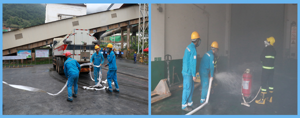 第二階段為聯(lián)合滅火演練。演練假設(shè)由于火勢(shì)蔓延較快,現(xiàn)有消防物資未能有效控制火情,指揮部緊急報(bào)告弋陽(yáng)海螺應(yīng)急指揮部請(qǐng)求支援。弋陽(yáng)海螺接報(bào)后,立即派出應(yīng)急救援隊(duì)伍和專家趕赴現(xiàn)場(chǎng)增援搶險(xiǎn)。在專家組的技術(shù)指導(dǎo)下,搶險(xiǎn)隊(duì)伍配合公司應(yīng)急救援隊(duì)進(jìn)入事故現(xiàn)場(chǎng)緊張有序地滅火。