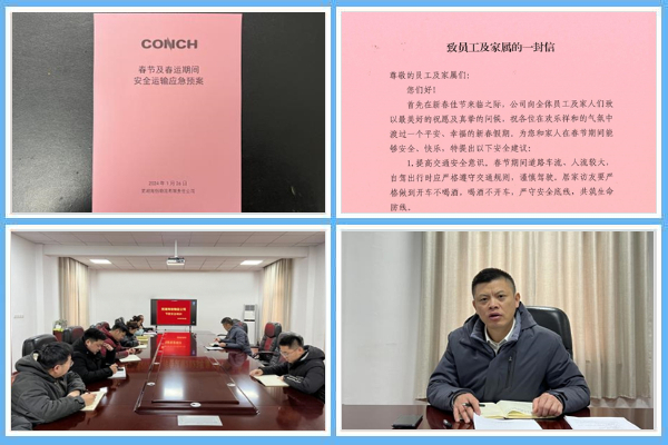 為進一步筑牢節假日期間全員安全思想防線,確保春節、春運期間公司運行安全平穩。2024年2月6日,公司組織開展了節前安全培訓會。會議傳達學習了海螺水泥、海螺環保EHS管委會會議精神,并結合節前全國天氣及道路通行狀況,重點組織各單位對公司春節及春運期間安全運輸應急預案進行了分解學習,以確保突發事件的快速有效處置。
