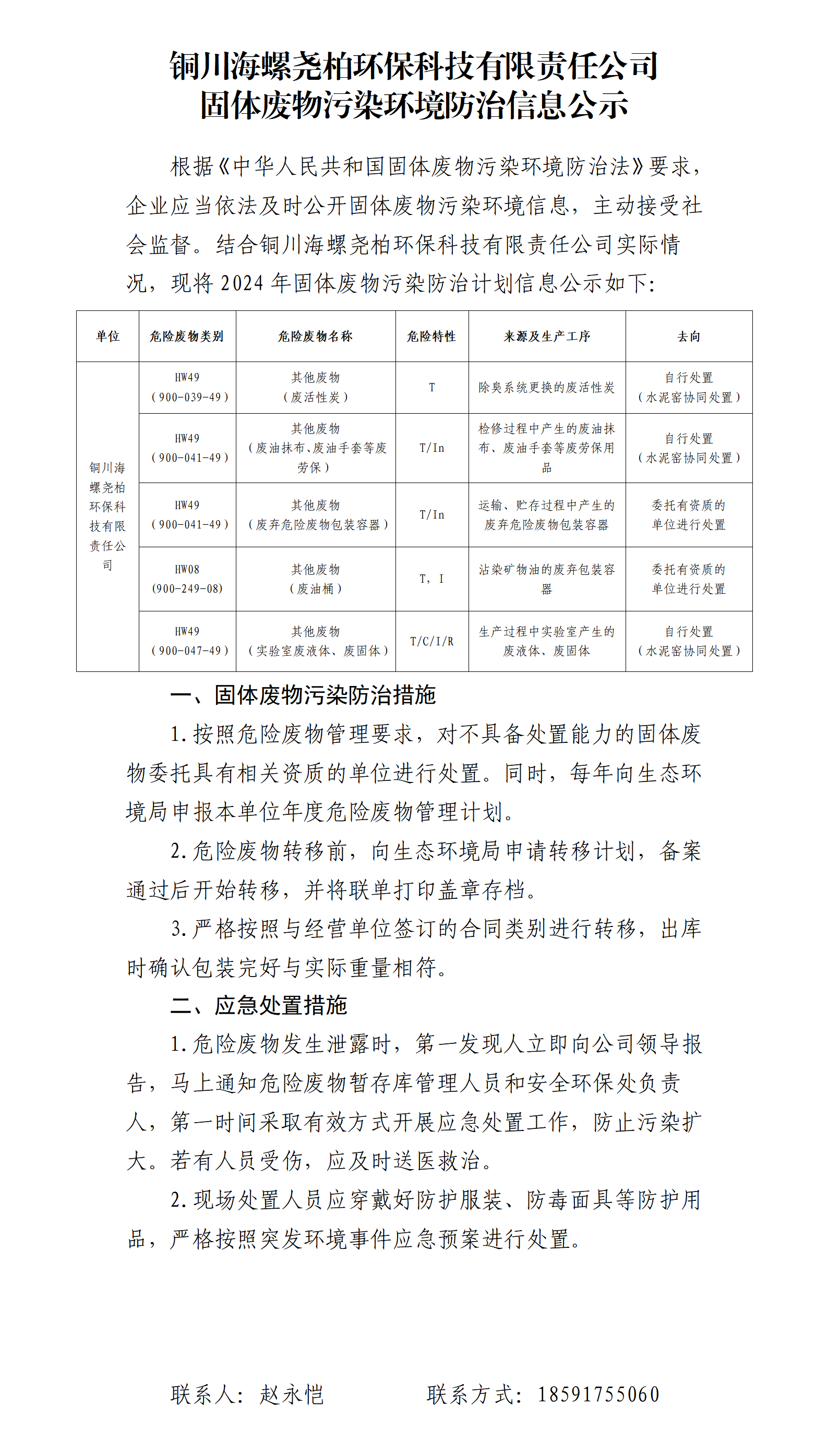 銅川海螺堯柏環保科技有限責任公司 固體廢物污染環境防治信息公示