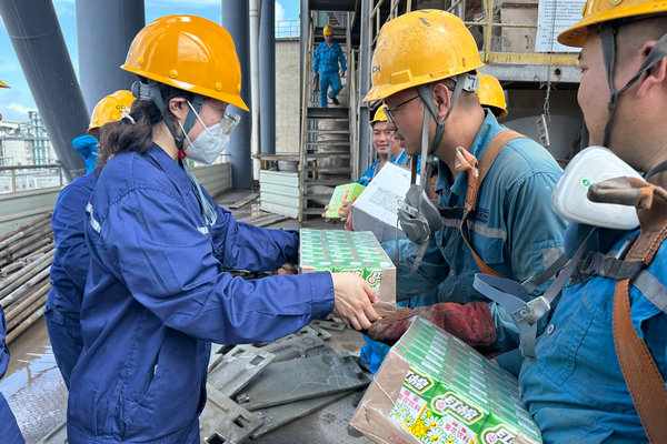 陽春環保公司職能人員積極響應公司號召,紛紛主動參加本次送清涼活動,她們按規范要求嚴格穿戴好勞保用品,把防暑降溫物資搬送到近60米高的檢修點,同時慰問檢修人員,叮囑他們一定要樹立“安全第一”的思想,注意防暑降溫,做好自我保護,平安度夏。