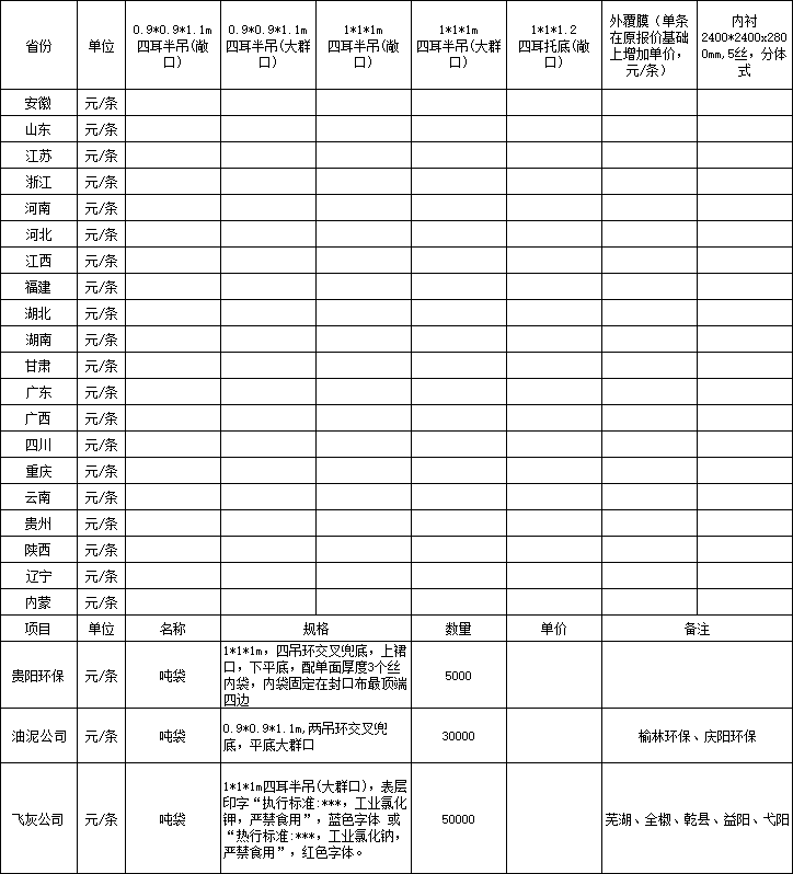 為做好安徽海螺環保集團有限公司下屬項目公司噸袋的供應工作,確保產品的可靠性、穩定性,規范采購行為,本著“公開、公平、公正”的競爭原則,選擇經營能力較好、產品質量較優、售后技術服務能力較強的供貨單位,特將本次招標的有關事宜公告如下,歡迎有實力的投標單位參加本次招投標活動: