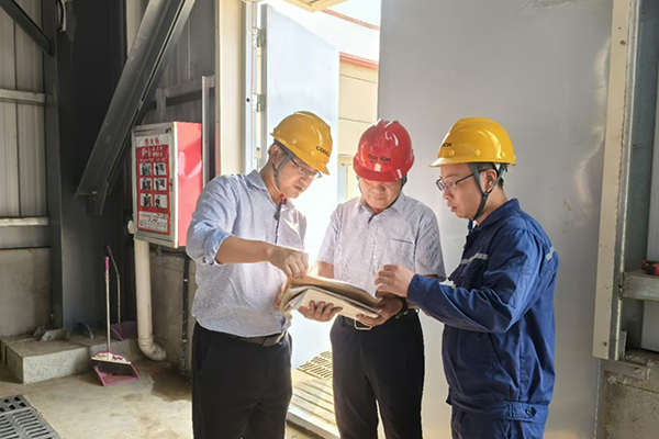 汪純健一行深入固廢生產現場,依次查看了圓盤干化、污泥壓濾等車間,重點了解了安全責任制落實情況、現場安全隱患排查治理情況。在圓盤干化車間內,他認真翻閱安全活動記錄本、設備點巡檢記錄本,全面了解基層安全履職和運行質量情況。