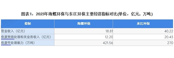 海螺環保和東江環保是中國危廢焚燒處理行業代表性服務商。從業務收入來看,2023年海螺環保業務收入約12.20億元,低于東江環保;從危廢處理能力來看,截至2023年末海螺環保危廢處理能力約421.56萬噸,東江環保約270萬噸。