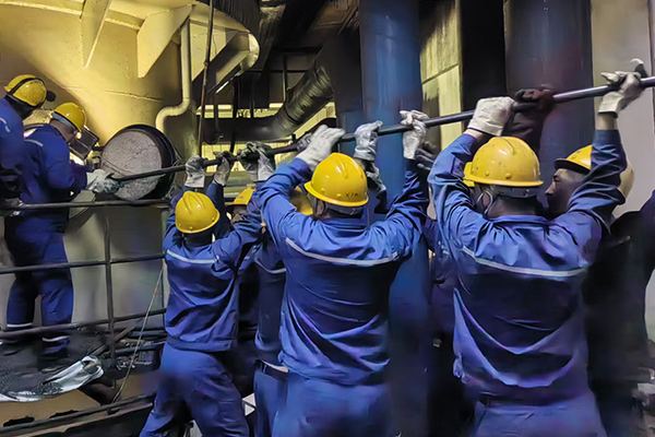 走進海螺環保武漢漢氏醫療廢物處置項目的生產車間一號焚燒爐旁,只聽見焚燒爐里面傳來“咚咚咚”的響聲,檢修人員神情凝重、緊張盯著焚燒爐。原來,檢修調試期間,焚燒爐結焦,導致調試運行不暢。在處理完底部的結焦后,維修人員帶著防護設備和風鎬,交替進入爐體,手動清理鏟除頂部的結焦層,高溫和敲擊產生的煙塵吞噬他們,汗水浸濕了他們.....,經過6個小時不間斷輪流艱苦奮戰,順利完成了結焦清理。