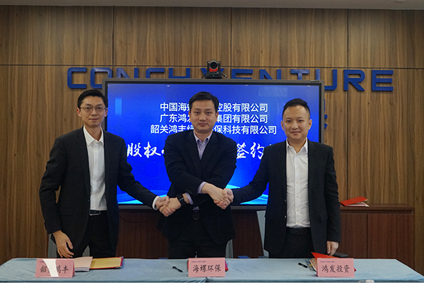 簽約儀式在海創環保(上海)公司第一會議室舉行。海螺環保總經理疏茂、鴻發投資董事長助理麥子俊、韶關鴻豐董事長劉煜明分別代表三方簽約。海螺環保總經理助理章邦志、投資發展部部長方存;鴻發投資副總裁黎建燁,助理總裁劉曉蘭;韶關鴻豐總經理危忠東等出席并見證簽約。