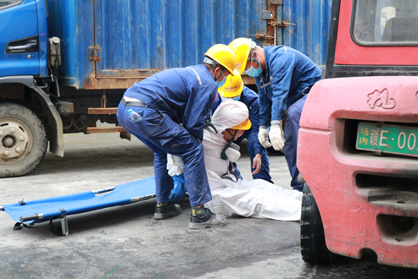 演練過程模擬叉車駕駛員因裝卸作業人員進入視角盲區,且未能安全控制車速,在倒車時物不慎將作業工人小腿壓傷。事故發生后,車間立即啟動應急預案,應急救援組、后勤保障組接到指令迅速響應,緊急維護現場秩序、疏散警戒,及時對傷者施救送醫,最大限度減少事故對周圍人員的傷害。