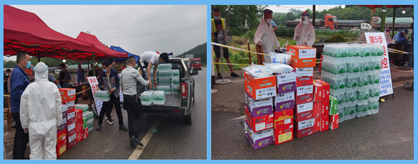 “太感謝了、今天下雨,還為我們送來這么多的愛心物資”、“同心合力、共同抗疫!”防疫點工作人員對公司積極支持地方防疫工作表示感謝。