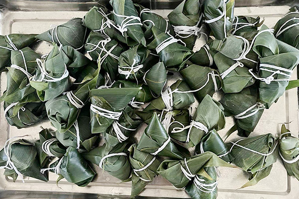 大家在廚師的指導(dǎo)下卷粽葉、放糯米、捆扎,粽葉在員工的手中上下翻舞,包粽子的手法要求:一折葉,二盛料、三壓實(shí),四包,五扎繩,看似簡(jiǎn)單,但要做個(gè)漂亮的粽子還是需要一點(diǎn)工夫的。很多員工都表示這是自己第一次親手包粽子,在大家的努力下,一個(gè)個(gè)誘人的粽子出籠了,雖然包出來的粽子沒有那么漂亮,但是自己親手制作,意義非凡。