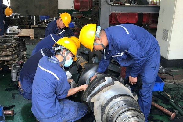 南方的夏天,就讓人感覺到“望暑生畏”,白天35度以上的高溫讓每一個人都腳步匆匆,只想快點進入到一個涼快的地方,可是,我們的一線員工卻身穿著長袖外套在崗位上揮汗如雨,堅守自己的本職工作。檢修現場,生產處處長王興正帶領技術人員組裝破碎機轉子。