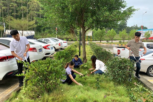 在辦公樓旁綠化帶,員工們正在綠化帶里管護綠化植物,他們頂著烈日、聚精會神地清理著綠化帶里的雜草,修剪綠植。