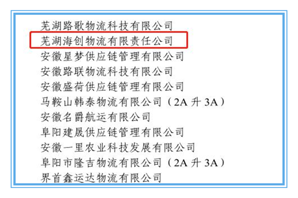 2022年8月24日,中國物流與采購聯(lián)合會(huì)發(fā)布了第三十四批A級物流企業(yè)名單,蕪湖海創(chuàng)物流有限責(zé)任公司順利通過評定,榮獲國家3A級物流企業(yè)稱號(hào)。