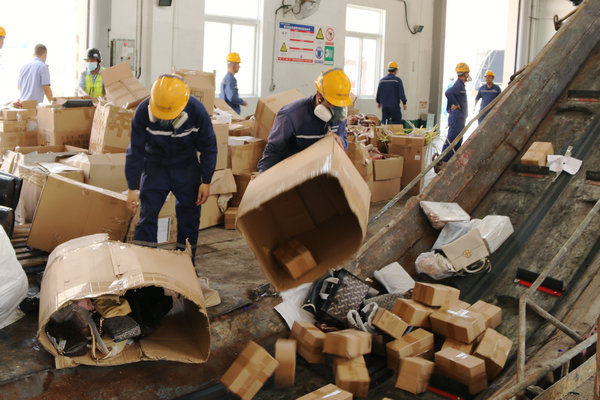 在固廢處置現場,兩輛裝滿假冒偽劣產品的貨車在公安人員押運下依次進入生產車間。工作人員有序對不法產品進行破碎后送入回轉窯焚燒。此次銷毀侵權和假冒偽劣產品案值約200萬元。