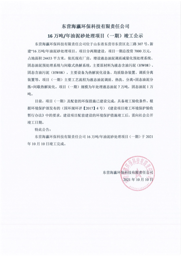東營海瀛環保科技有限責任公司16萬噸年油泥砂處理項目(一期)竣工公示2021年10月10日.pdf