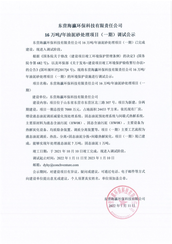 6萬噸年油泥砂處理項目(一期)調試公示2022年1月11日