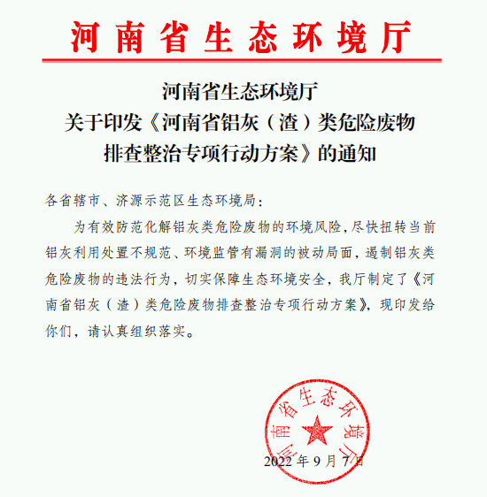 2021年1月1日,國家將鋁灰(含渣,以下簡稱鋁灰)增補納入《國家危險廢物名錄》按照危險廢物進行管理。河南省生態環境廳為有效防范化解鋁灰類危險廢物的環境風險,遏制鋁灰類危險廢物的違法行為,切實保障生態環境安全,組織各市縣開展鋁灰(渣)類危險廢物排查整治專項行動。