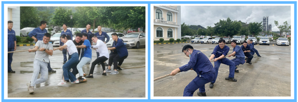 拔河比賽采取循環賽制,參賽隊員扎好馬步,鉚足干勁抓緊麻繩。“預備,開始!”隨著裁判一聲哨響,兩支隊伍的人員都使出全身力氣,身體往后仰,嘴里喊著響亮的口號。旁邊觀賽的伙伴們都在為比賽加油打氣,現場比賽氛圍非常熱烈。